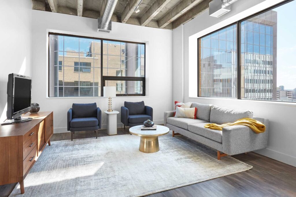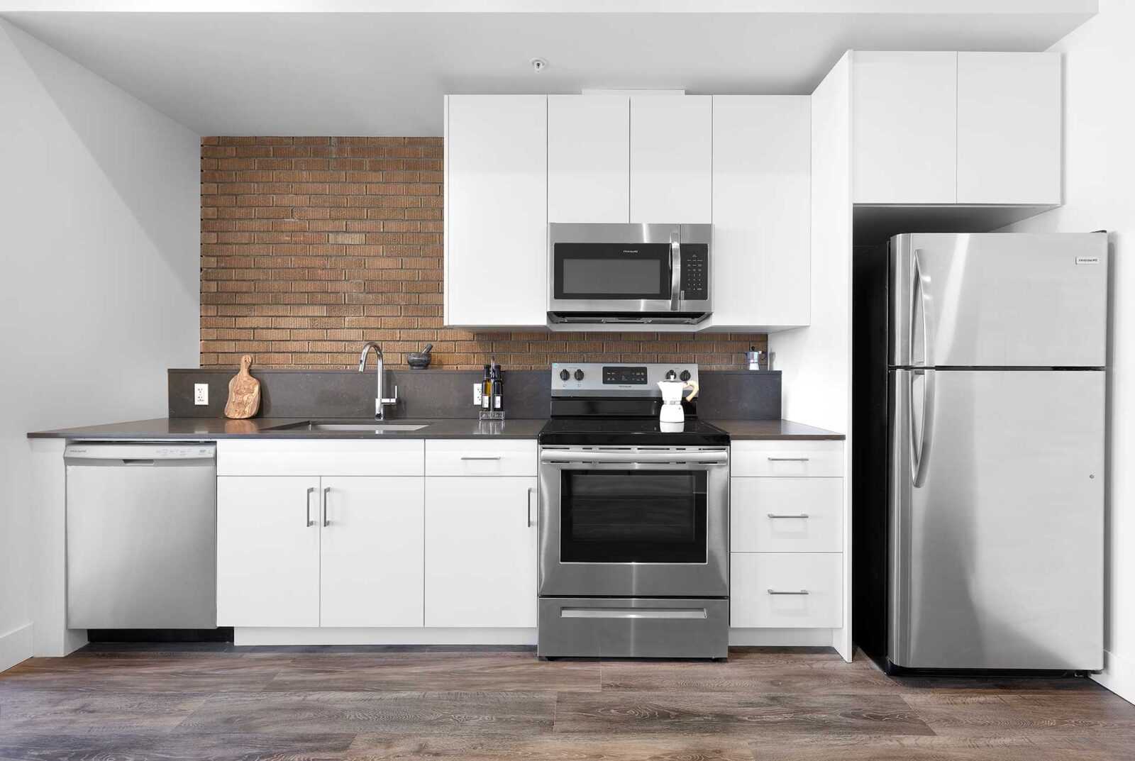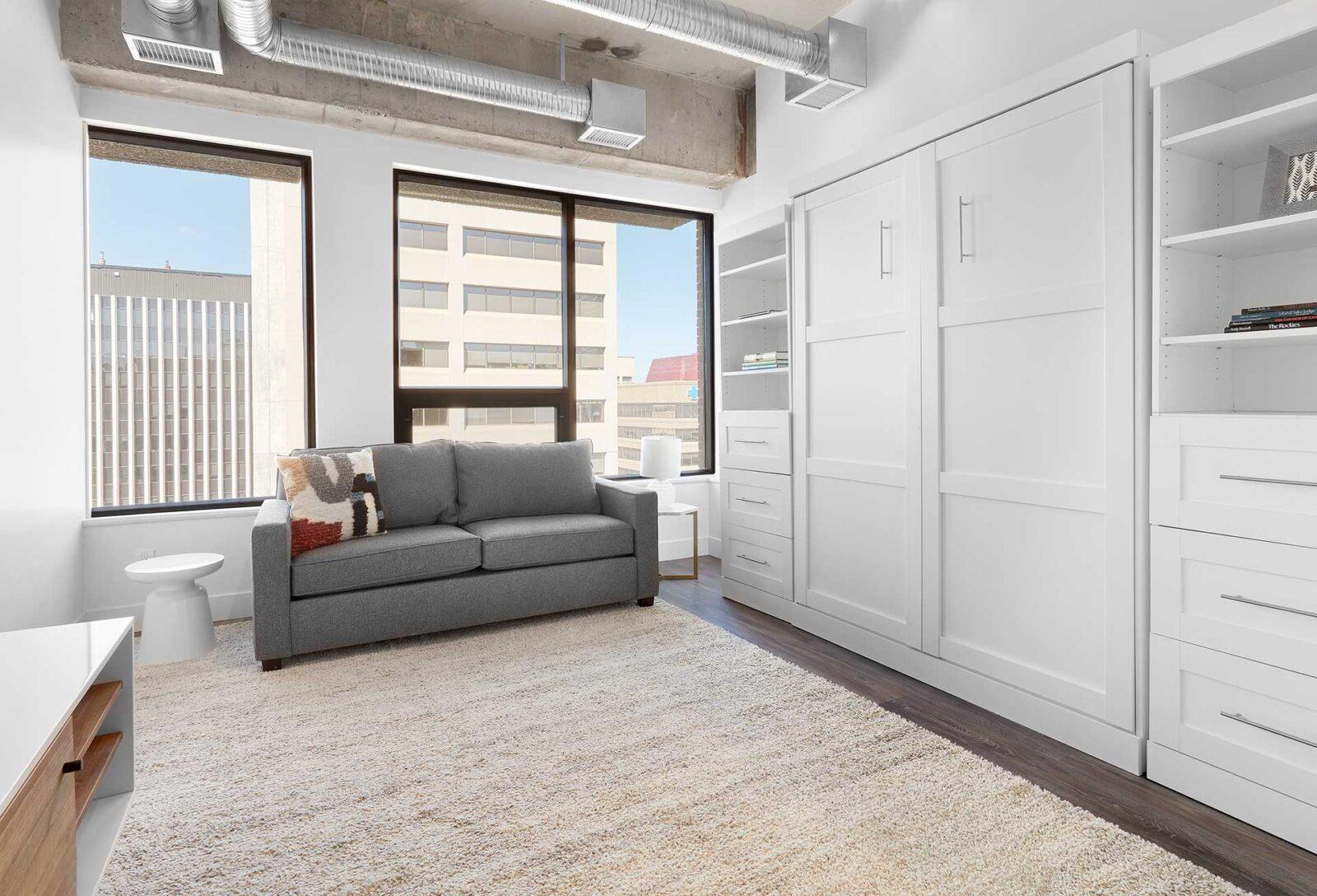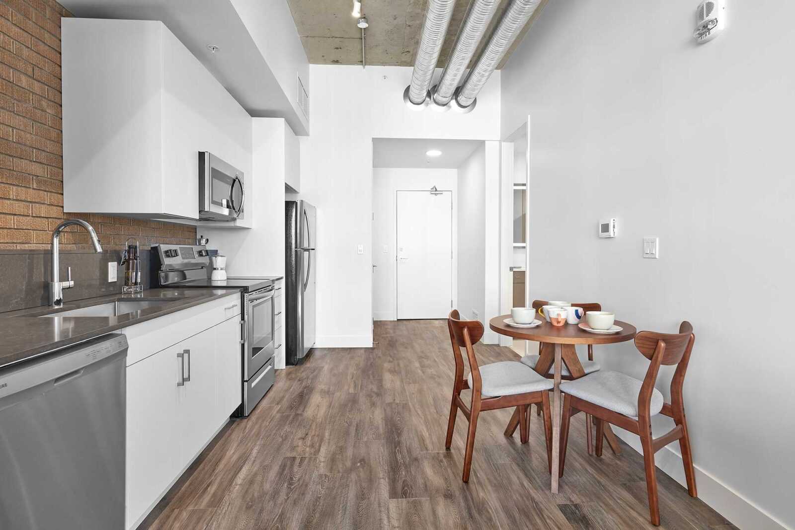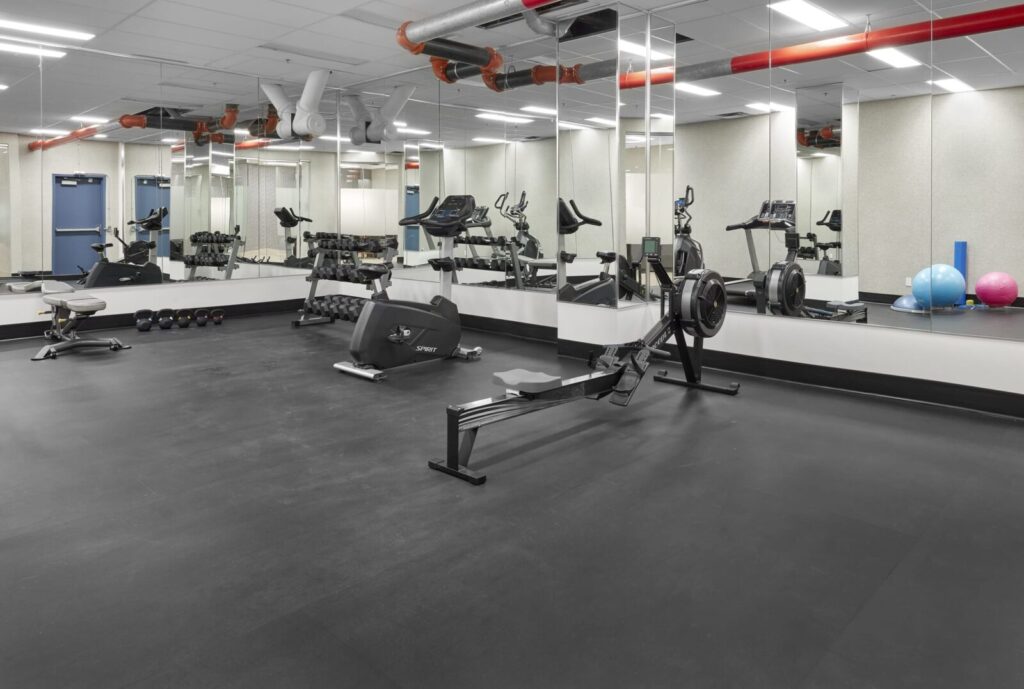 The gym is an elevator ride away. Our secure 24-hour on-site workout room is equipped with spin bike, elliptical trainer, rowing machine, treadmill, weights, and a stretching area. 100 House is conveniently situated within walking distance of LRT/transit, MacEwan University, and the picturesque River Valley.